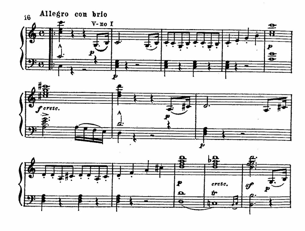 Так и в легкой, «танцевальной» главной теме (отчасти напоминающей главную партию из симфонии Моцарта «Юпитер») вместо обычной замкнутой симметрии с самого же начала преобладает целеустремленное движение. В ней уже содержатся элементы изложения, развития и «суммирования» (Восходящее движение мелодии, мотивное вычленение, дробление в третьей четверти, модуляции, оркестровое нарастание – все это создает эффект последовательного развития.). В сонатных allegro ранних венских классиков эффект tutti играл роль обрамления по отношению к завершенному «излагающему этапу» главной партии. Здесь же оркестровое tutti участвует в развитии, вторгаясь в момент «суммирования», до окончания изложения самой темы: