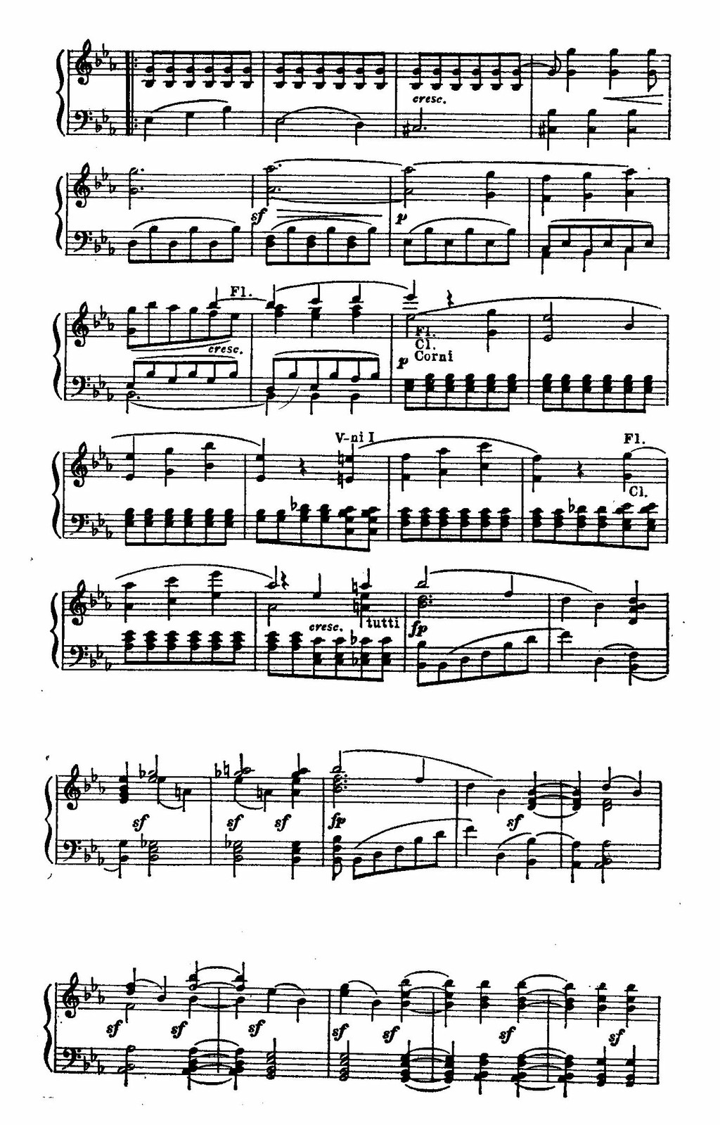 Максимально контрастирует с трагической главной темой эпизод C-dur, полный светлого, героического настроения. Здесь ясны связи с жанровой музыкой, слышатся военные барабаны и трубы, почти зрительно возникает картина торжественного шествия;