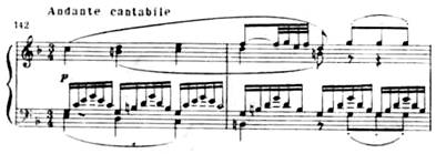 Особенно драматична связующая партия с ее минорным ладом, синкопами, пульсирующими триолями, уменьшенными гармониями: