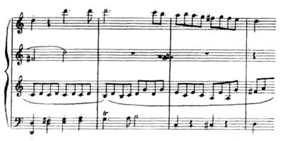 Третья часть. Основная тема третьей части (менуэта) имеет общность с темой побочной партии первой части: начальному восходящему хроматическому ходу отвечает нисходящий хроматический ход в теме менуэта:
