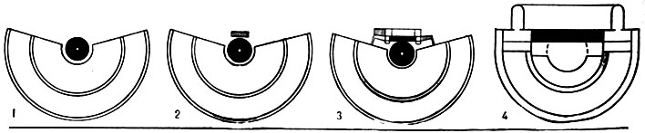 1. Орхестра. 2. Скена. 2-я пол. 5 в. до н. э. 3. Проскений. 1 в. до н. э. 4. Сцена древнеримского театра (действие происходит на просцениуме)