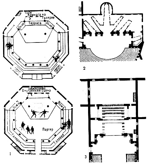 Планы сцен: 1. Шекспировского театра «Глобус». 2. Т-ра «Олимпико» в Виченце. 3. Т-ра «Фарнезе» в Парме