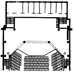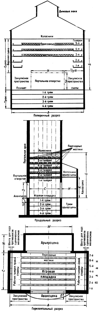 Классическая сцена-коробка (сверху вниз): поперечный, продольный и горизонтальный разрезы