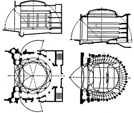 Для равномерного распределения звуковой энергии форма зала должна быть компактной и пропорциональной. При этом необходимо обеспечить поступление возможно большего числа ранних звуковых отражений, запаздывающих по сравнению с идущим от источника прямым звуком не более, чем на 0,035 сек для залов драм. театров и не более, чем на 0,05 сек — для оперных. Вредное влияние на акустику зала оказывают большие вогнутые поверхности (напр., купольные и сводчатые формы потолков), фокусирующие отражённый звук. В зонах такого фокусирования получается повышенная интенсивность звука, приводящая к неравномерности звукового поля, переходящей при большом запаздывании отражённого звука в раздельное эхо.