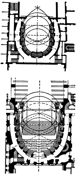 В нач. 17 в. был создан т. н. ранговый т-р с ярусным зрительным залом, принципиально отличный от амфитеатров античной демократии. Идея полукруглого театр. зала с амфитеатром и ярусными галереями по его периметру зародилась еще в эпоху Возрождения. Изображение такого зала дано арх. М. Чезариано в комментированном им издании трактата Витрувия (1521). Процесс формирования ярусного З. т. ускорила возникшая в Италии опера (16 в.), для которой нужен был достаточно вместительный и вместе с тем компактный зрительный зал с хорошей акустикой. В 1630 арх. А. Сегицци построил в Венеции т-р «Сан-Кассиано», зрительный зал к-рого имел три яруса сплошных открытых галерей с возвышающимися друг над другом рядами. Сословная разобщённость зрителей рангового т-ра привела вскоре к разделению галерей поперечными перегородками, так образовались изолированные ячейки — ложи. В последующие десятилетия продолжаются напряжённые поиски наиболее совершенной формы зрительного зала. Об этом, в частности, свидетельствует трактат итал. архитектора и театр. машиниста К. Мотта (1671). Многоярусный зал с ложами в форме усечённого в плане овала (получил впоследствии наименование «итальянского») был впервые осуществлён арх. К. Фонтана в построенном им т-ре «Тординона» в Риме (1675). Вершина архитектуры З. т. этого типа — знаменитый оперный т-р «Ла Скала» в Милане (1778), сооружённый по проекту арх. Дж. Пиермарини. Зал т-ра «Ла Скала», вмещающий 3 тыс. зрителей, безукоризнен в акустич. отношении, но значительная часть зрителей плохо видит происходящее на сцене. Т. о., в этом т-ре наглядно проявились недостатки сочетания многоярусного зала с глубинной сценой.
